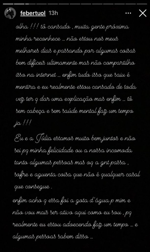 Bertuol, por sua vez, postou um textão no Story alegando que não está passando por uma boa fase e essa mentira foi a gota d’água. Ele finalizou dizendo que irá se afatar um pouco das redes sociais e que o casal está feliz.