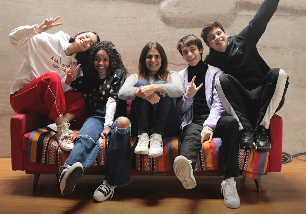 Da esq. pra dir.: João Victor (Vinícius), Laura Luz (Mila), Malu Mader (Elis), Dani Flomin (Pierre) e Yuki Sugimoto (Juliana)