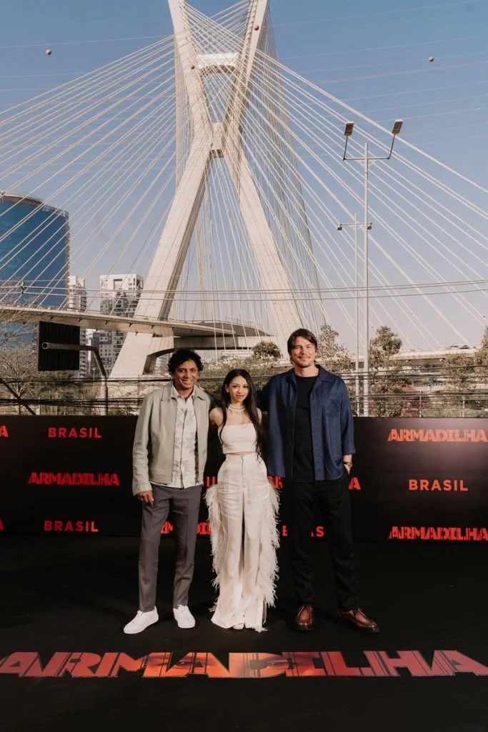 Pensando no sucesso da turnê atual da loirinha, e todos os aspectos que compõem sua carreira atualmente, “Armadilha” não poupou esforços em criar um show de verdade durantes as filmagens da obra. Até como forma de promover o filme, o diretor pensou em fazer uma turnê mundial que passou por diferentes países, inclusive o Brasil, para falar de seu novo longa! Confira uma imagem dele com sua filha e o protagonista, Josh Hartnett, em São Paulo: