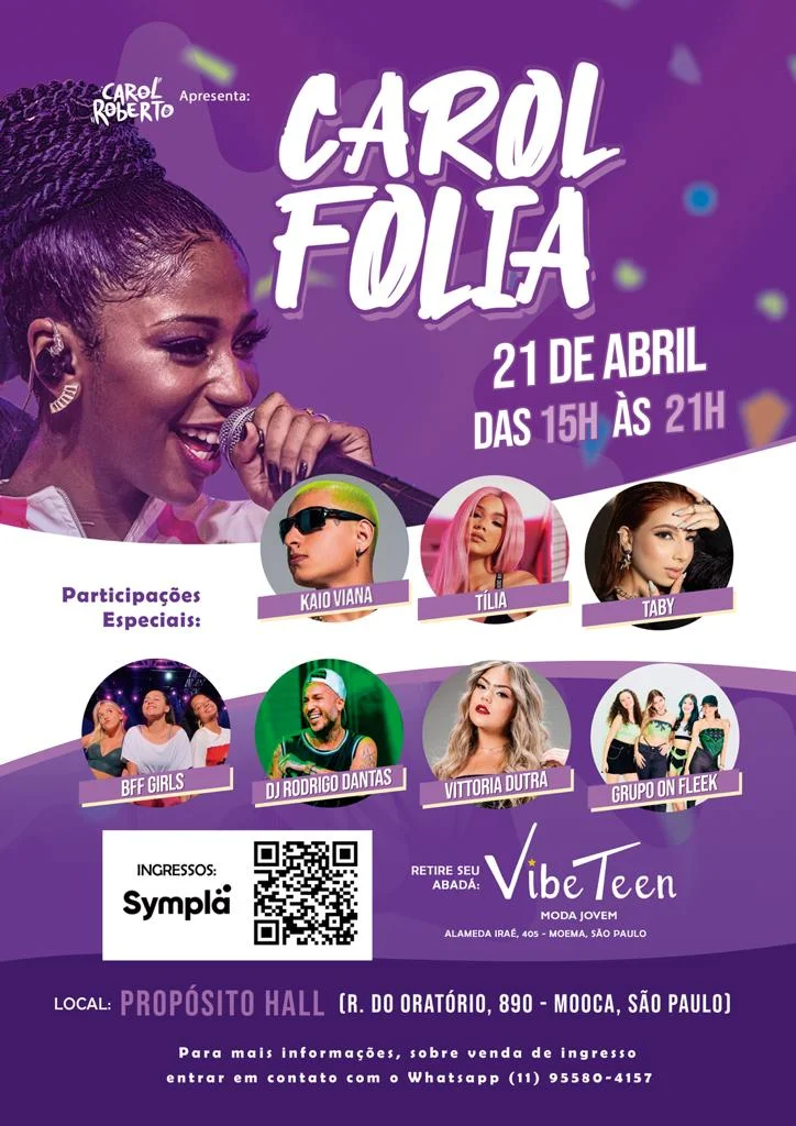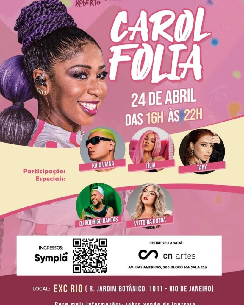 Por fim, Carol reforçou a convite a todos. “Galera, dia 21 é feriado então junte os amigos, chame a família e venham se divertir comigo no Carol Folia, está incrível o line-up da festa.”
