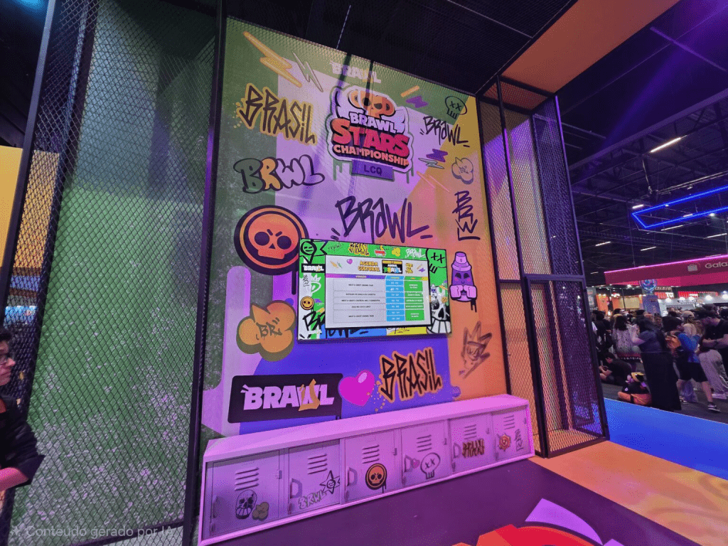 Se a tônica da feira foi “experienciar”, Brawl Stars levou isso ao extremo. A Supercell montou um espaço gigantesco, com múltiplas ativações, disputas com criadores e uma área de troca de tickets por brindes que não parou um minuto.