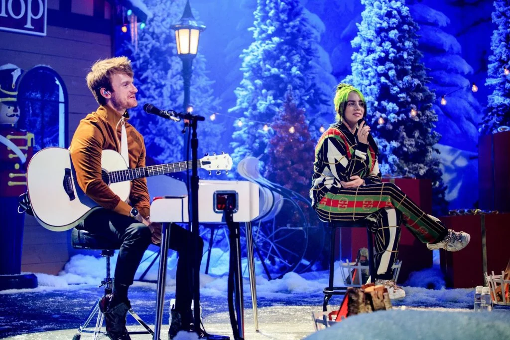 Billie, por exemplo, estava acompanhada de seu irmão Finneas em frente a Oficina do Papai Noel. O cenário ainda tinha o trenó do velhinho, neve falsa e todo aquele ar mágico do Polo Norte.