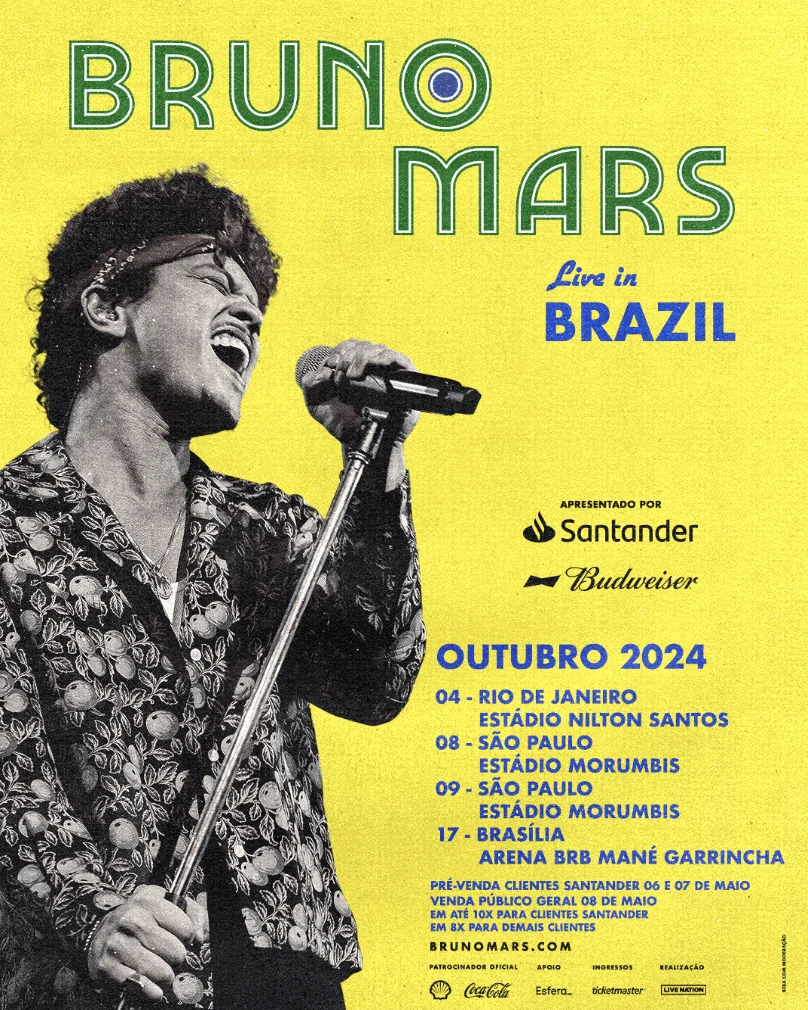 Assim, a tão aguardada volta de Bruno Mars ao país deixará os fãs ainda mais em êxtase e os que forem clientes Santander ainda tem uma surpresa especial! A pré-venda exclusiva acontece entre os dias 06 e 07 de maio, começando às 9h online e 11h na bilheteria oficial para o show de São Paulo. Assim, para os shows do Rio de Janeiro e Brasília, as vendas começam 11h online e 13h nas bilheterias oficiais.