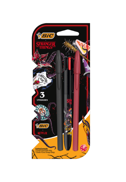 A coleção chega em embalagens com 1, 4 e 12 unidades. Além disso, também tem um kit especial que inclui uma BIC 4 Cores “Stranger Things” e duas canetas BIC Cristal Efeito Matte nas cores vermelho e preto. Essa linha também marca a expansão da Cristal Efeito Matte para novas tonalidades, reforçando o equilíbrio entre inovação e tradição.