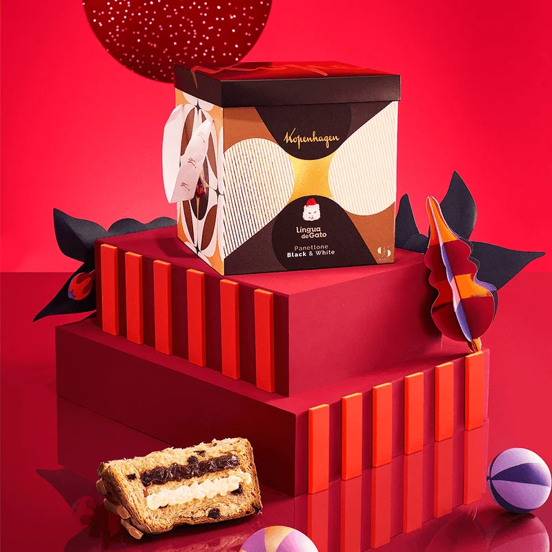 A Kopenhagen nos presenteou com uma maravilhas de Língua de Gato Black & White e custa R$157,90 na loja da marca. Assim, o panettone com gotas de chocolate ao leite com recheio de chocolate ao leite tradicional e recheio de chocolate branco, coberto com chocolate ao leite e decorado com lingueta de chocolate ao leite.