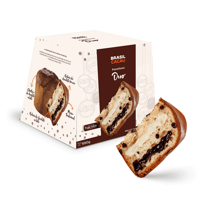 Por fim, a Brasil Cacau também enviou dois sabores de panettone para nossa redação. O primeiro foi o Duo. Panettone com gotas de chocolate ao leite e recheio de chocolate ao leite trufado e chocolate branco, parcialmente coberto com o chocolate ao leite e está no valor de R$84,90 no site do Brasil Cacau.