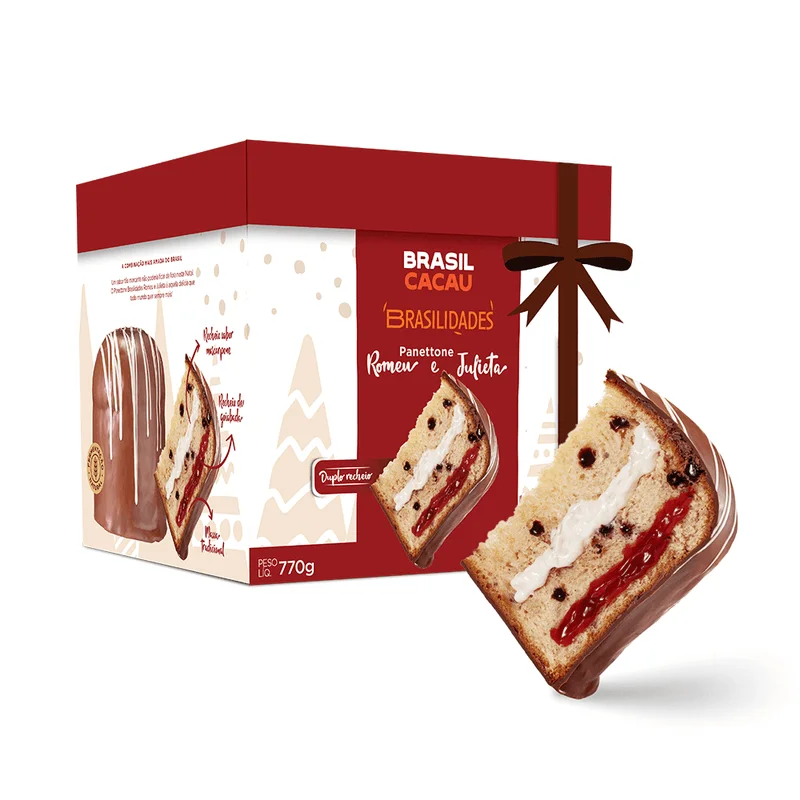 Já o Panettone Brasilidades Romeu e Julietta é com gotas de chocolate ao leite recheio sabor goiaba e sabor mascarpone, coberto com chocolate ao leite por inteiro e decorado com riscas de chocolate branco.