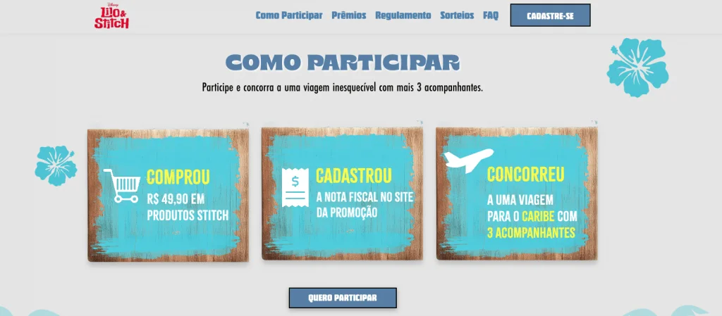 Por isso, além das novas coleções, a Disney Brasil preparou uma surpresa incrível: uma promoção especial que sorteará uma viagem para Barbados, no Caribe, para um ganhador e três acompanhantes! Dessa forma, para participar da ação, basta comprar produtos Stitch a partir de R$49,90 entre 21 de abril e 26 de junho de 2025 e cadastrar a nota fiscal no site oficial.
