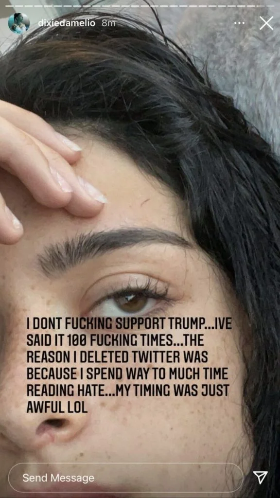 E não é que os fãs estavam parcialmente certos! Por meio dos Stories, Dixie revelou que deixou o Twitter por passar muito tempo lendo ódio gratuito. “Eu não apoio o Trump. Eu já disse isso 100 vezes… O motivo pelo qual excluí o Twitter foi porque passo muito tempo lendo o ódio. É simplesmente terrível”, escreveu.