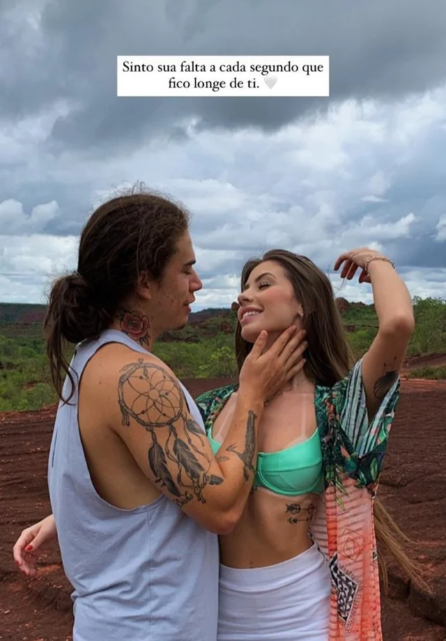 Pelos stories, a estudante de Engenharia compartilhou uma foto ao lado de Whindersson com a seguinte frase: “Sinto sua falta a cada segundo que fico longe de ti”. Fofa, né?