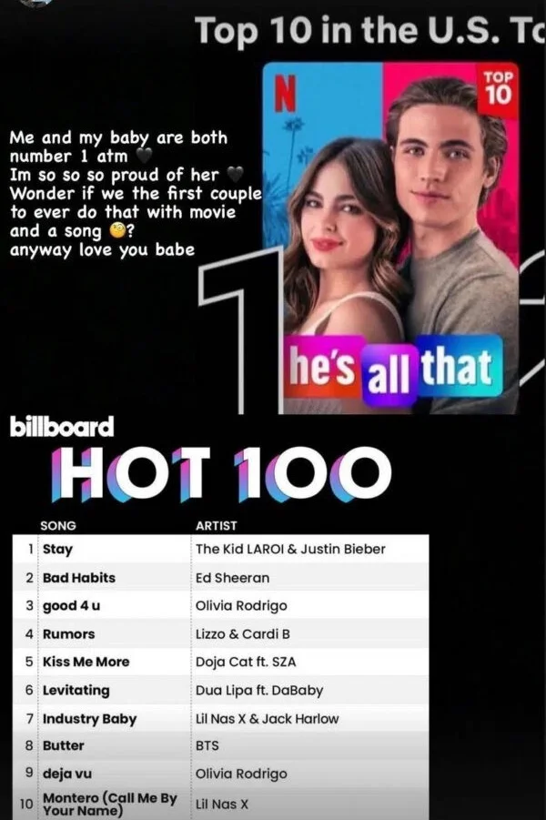Omer postou um story falando sobre o filme da girl, que está como o mais assistido na Netflix dos Estados Unidos, ao lado de uma foto do ranking da Billboar, que tem no 1º lugar uma canção produzida por ele.