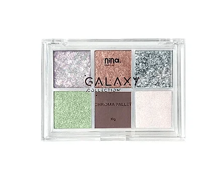 A Paleta Ursa Maior Galaxy Nina Makeup entrega seis sombras exclusivas com acabamentos matte, cintilante e o inovador Body Glitter Gel prensado, tecnologia inédita no Brasil. A textura amanteigada facilita a aplicação, e a pigmentação intensa garante looks que duram por horas, seja para o dia ou para um evento mais glamouroso à noite.