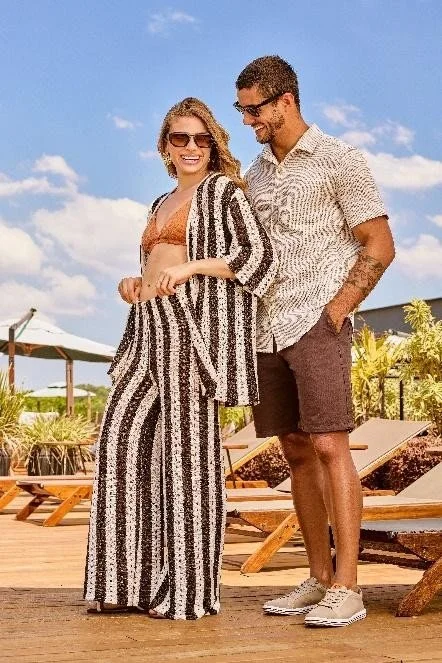 Entre os destaques estão: vestidos em diferentes shapes, conjuntos estampados e itens em tecidos artesanais como tricô e sarja. Já a Linha Fitness e Beachwear completa a coleção com uma paleta soft/pastel e detalhes naturais, refletindo a identidade moderna e leve da marca.