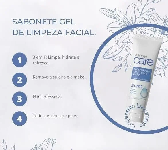 Como funciona: o Avon Care Gel de Limpeza Facial 3 em 1 remove sujeira, maquiagem e impurezas de forma delicada, sem agredir ou ressecar a pele. Sua fórmula ajuda a manter a hidratação natural, reduzindo o risco de descamação e deixando a pele limpa, macia e com sensação refrescante.