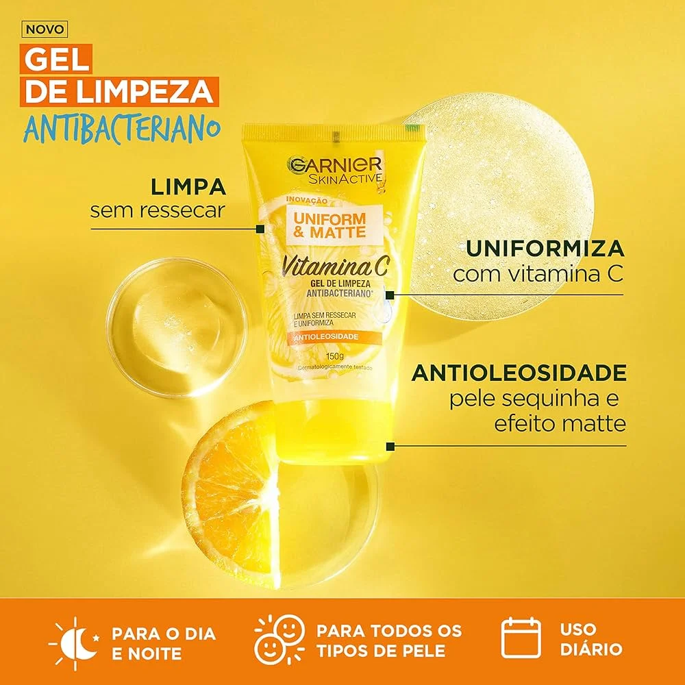 Como funciona: o Gel de Limpeza Facial Antibacteriano Uniform & Matte Garnier limpa profundamente sem ressecar, removendo impurezas, resíduos de poluição e excesso de oleosidade. A vitamina C atua com ação antioxidante, ajudando a deixar a pele mais uniforme e com aspecto matte, enquanto o pantenol contribui para manter a hidratação e o conforto da pele durante e após a limpeza.