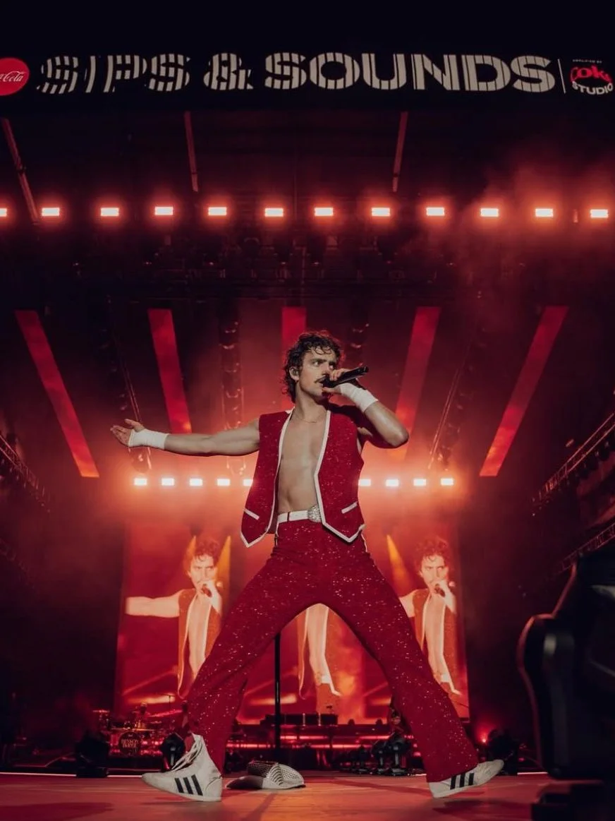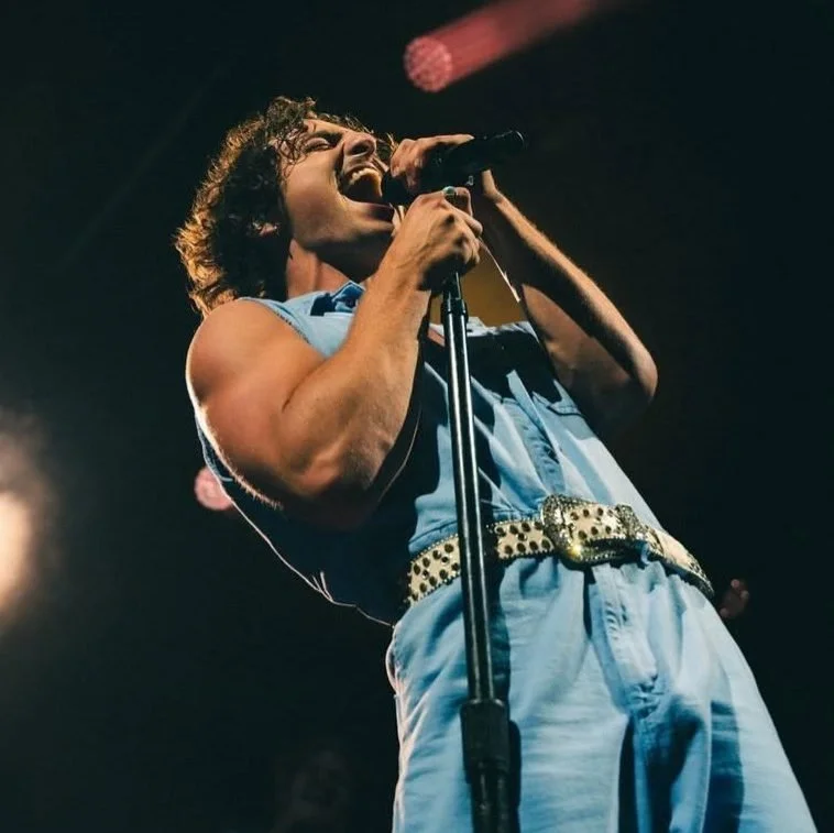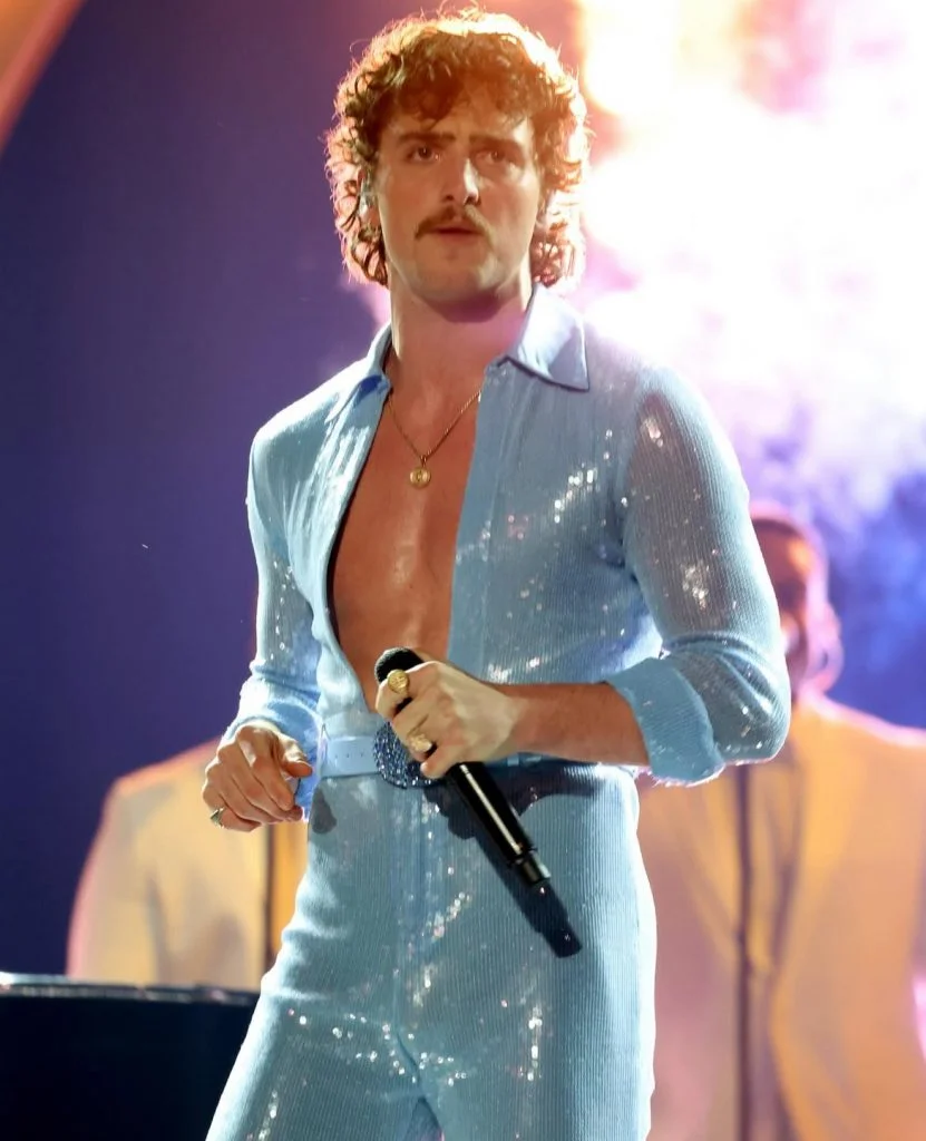Por fim, ainda no sábado, temos outro artista revelação: Benson Boone. Além de ser candidato do Grammy, o cantor chama atenção pelas sua voz e performances ao vivo. Da nossa seleção, esse é um pouco mais diferente! Benson tem dois pontos chaves: os macacões e o brilho.