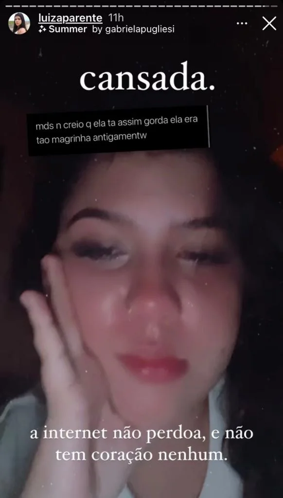 Aparecendo chorando nas imagens, Luiza foi direta ao dizer que ninguém tem o direito de opinar sobre o corpo de alguém, e pediu para pararem com o hate. “Não aguento mais me torturar todo dia com isso.”