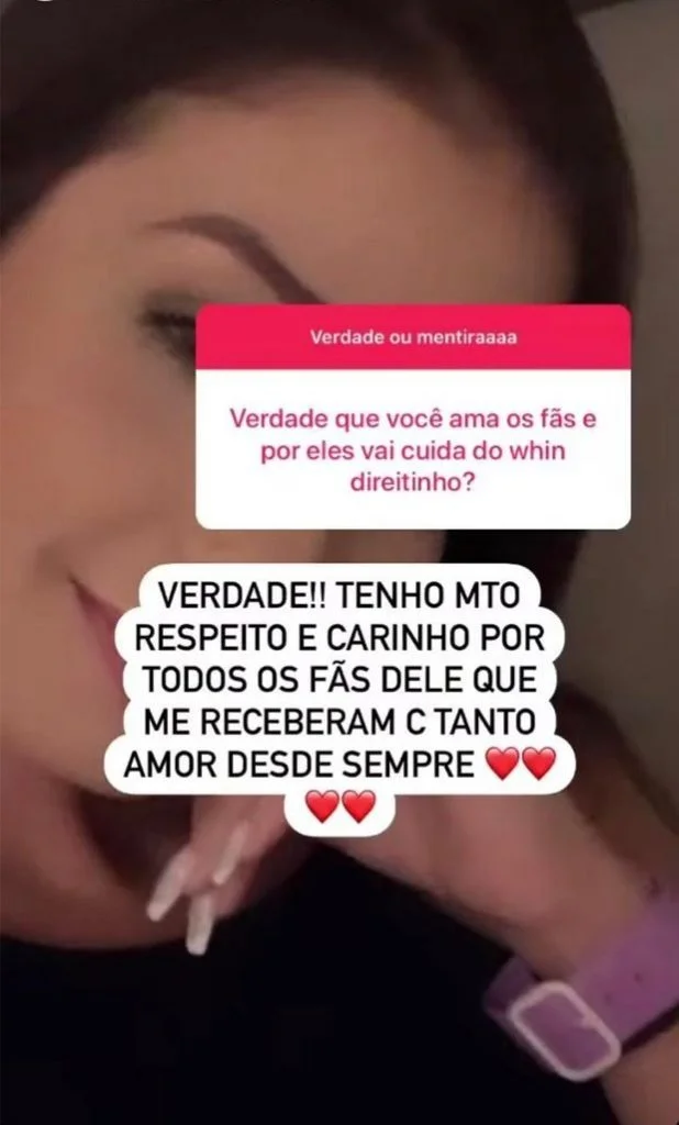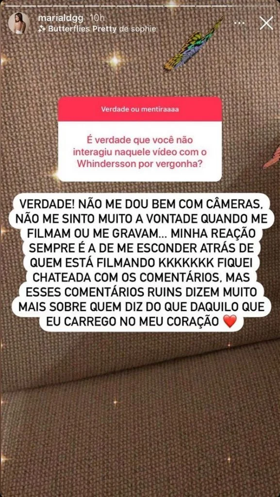 Botando um ponto final nesse assunto, Maria explicou porque não interagiu com Whindersson no fatídico vídeo. A resposta veio durante um jogo de “verdade ou mentira” realizada nos stories, após um seguidor perguntar se era verdade que sua falta de reação for por causa de vergonha.