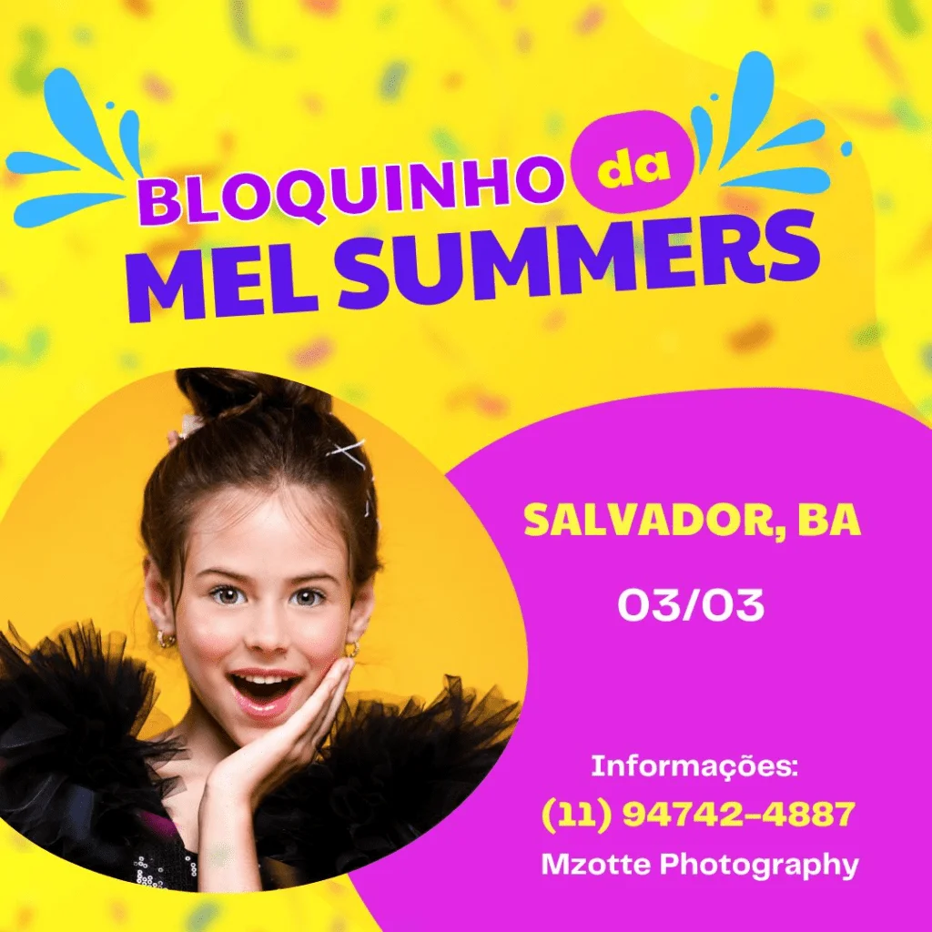 Por isso, com um conceito voltado para o público infantil e suas famílias, o “Bloquinho da Mel Summers” promete ser um espaço lúdico e seguro para os pequenos foliões. Com direito a músicas animadas, fantasias coloridas e uma energia contagiante, o bloco será uma das grandes atrações infantis do Carnaval de Salvador. “Quero que todo mundo venha se divertir comigo! Vai ter muita música, confete e alegria! Vamos fazer um Carnaval lindo para todas as crianças curtindo!” convida Mel para todos que acompanham suas postagens e seus trabalhos. Então, além da postagem no Instagram, confira o convite com mais detalhes desta comemoração: