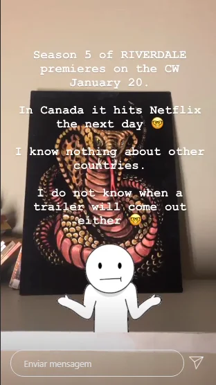 “A 5ª temporada de Riverdale vai estrear no CW em 20 de janeiro. No Canadá, chega na Netflix no dia seguinte. Não sei nada sobre outros países. Também não sei quando o trailer será liberado”