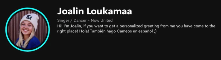 Alô Uniters, vocês sabiam que agora podem ter um vídeo exclusivo e personalizado da Joalin Loukamaa? É isso mesmo! A integrante finlandesa do Now United revelou pelos Stories que criou uma conta no Cameo.