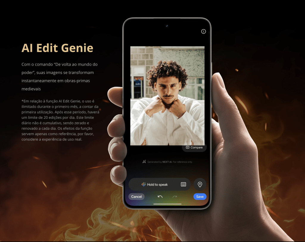 O celular ainda oferece o recurso AI Edit Genie, que reconhece comandos de voz em mais de 20 idiomas e permite editar imagens em segundos, inclusive recriando looks medievais ou paisagens dignas de Winterfell.