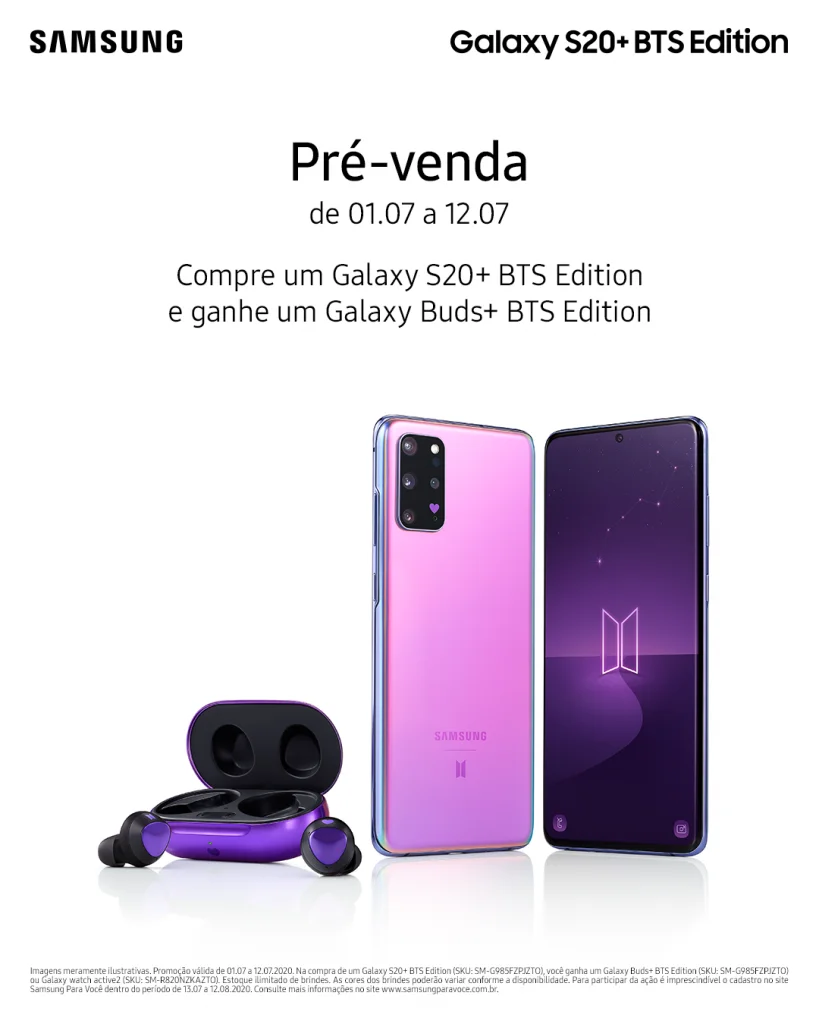 Agora chegamos na melhor parte: o Galaxy S20+ BTS Edition já está na pré-venda e, se você fizer a compra, vai ganhar um Galaxy Buds+ BTS Edition – um fone de ouvido super lindo!