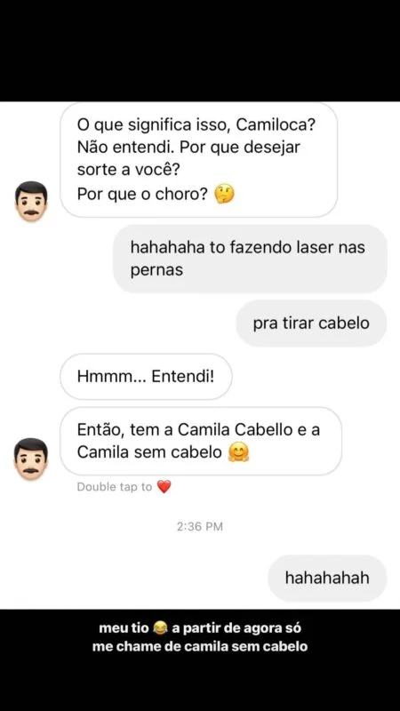 A atriz estava falando para o parente que ia fazer uma depilação e, sem querer, trocou a palavra “pelos” por “cabelo”, o que fez com que seu tio fizesse uma piada com a cantora Camila Cabelo, a chamando de Camila sem cabelo. Confira a publicação: