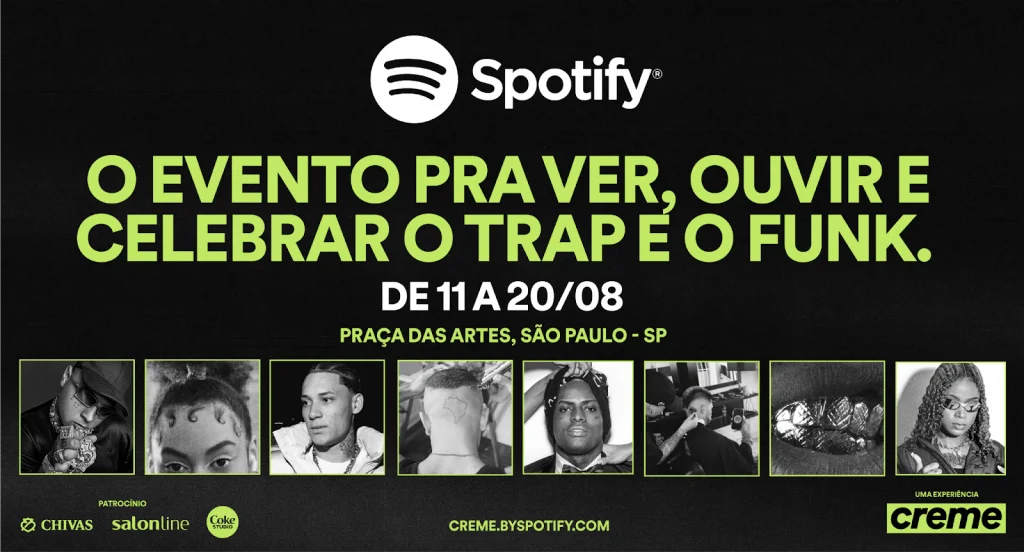 Já imaginou sua playlist virando uma experiência na vida real? Por isso, o Spotify está chegando com mais uma novidade para os fãs de Trap e Funk. Do dia 11 a 20 de agosto, a playlist creme, que mistura artistas e faixas mais populares desses gêneros, se transforma em uma exibição interativa grátis.