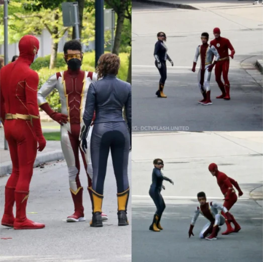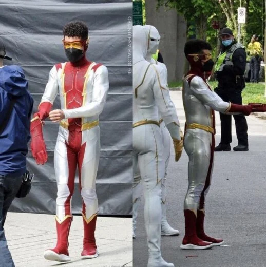 O figurino de Jordan é bastante chamativo, nos tons de branco, vermelho e amarelo. As fotos não dão muito spoiler da série, mas dá para ver que ele já está gravando cenas com o Flash.
