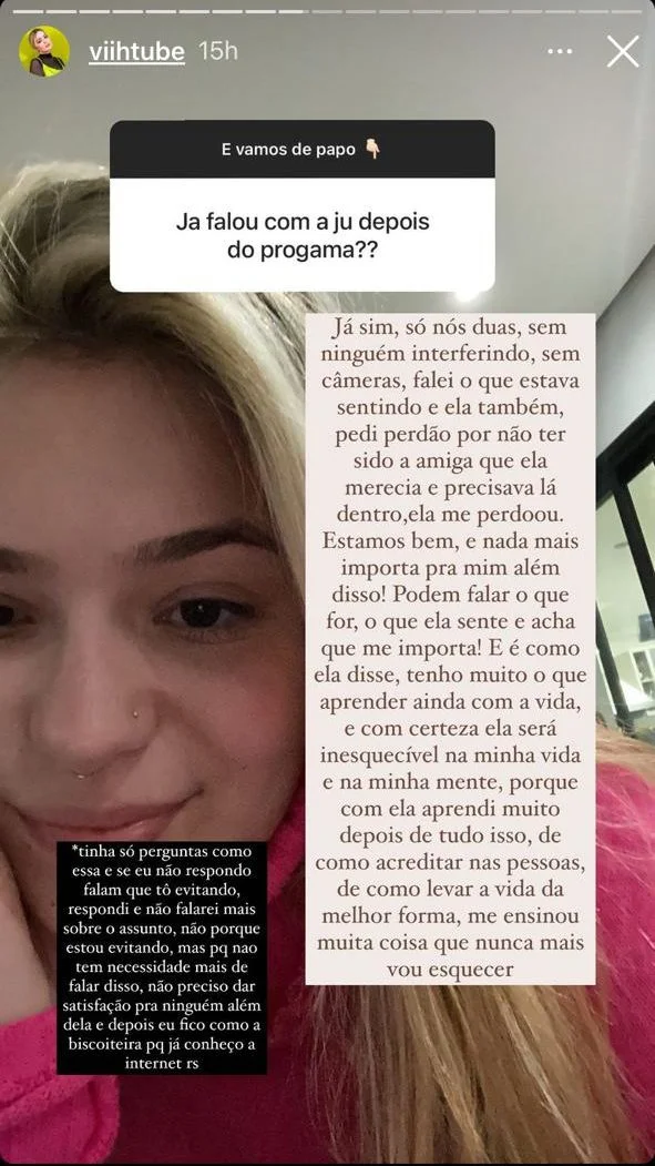Respondendo perguntas do seguidores no Story, Viih foi questionada sobre sua atual relação com a campeã. Ela contou que as duas conversaram, longe das câmeras, e pediu desculpas por não ter sido a amiga que Ju precisava dentro da casa.