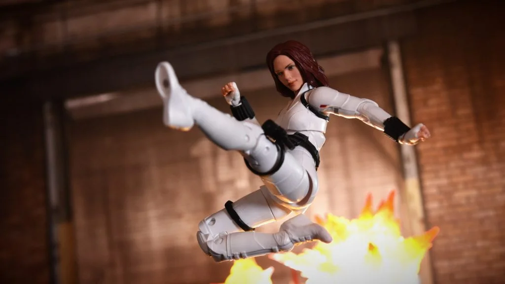 A Hasbro fez versões de agente Natasha Romanoff (novo verdadeiro da Viúva Negra) em action figures. Ela será vendida na linha Marvel Legens, que é super articulada e tem outros personagens do filme, e na versão Titan Hero, que tem quase 30 cm e é colecionável com bonecos de filmes anteriores dos heróis da Marvel.